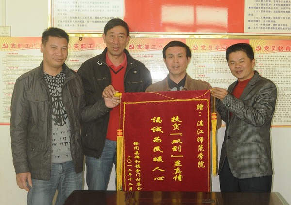 座谈会上,村委会和贫困户吴登义,分别赠送锦旗给我校,衷心感谢湛师党委三年多来积极开展对口帮扶工作。村委会送锦旗的内容为“扶贫‘双到’显真情 竭诚为民暖人心”;吴登义送锦旗的内容为“扶贫济困 情系百姓”。梁英书记代表学校党委受旗。此前,村民为表谢意,已赠送11面锦旗给我校党委及二级帮扶党组织。