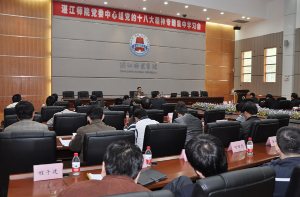 湛师新闻网12月7日讯 6日下午,我校党委理论学习中心组在国际会议厅举行了以“学习宣传贯彻党的十八大精神”为主题的集中学习会。会议邀请思政部主任何增光教授及法政学院院长袁铎教授作了专题发言。校领导梁英、刘海涛、黄钢、李永全、刘周堂、李江凌,全体中心组成员、党委委员、全校正处级干部参加了学习会。会议由梁英书记主持。