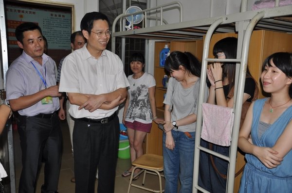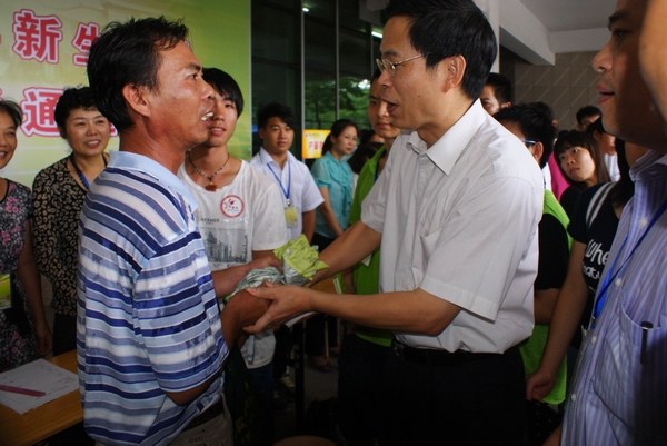 在此过程中,罗海鸥院长了解到一位来自雷州的家长带着三个儿女来我校报到,一对龙凤胎分别被录取到我校体科院和外语院,姐姐经过复读一年也被录取到我校基础教育学院。三姐妹同时报读湛师,是这个家庭对学校的信任与认可,该家长对孩子争气考上大学倍感欣慰,但同时也意味着父亲肩上挑着三个大学生费用的巨担。身为人父的罗院长,深深体会到这父亲的难处,一了解到这家庭的情况他便立即掏腰包塞了500元给这位家长,并鼓励孩子要争气努力,好好读书,报答家长。罗海鸥院长表示学校会尽力帮助家庭有困难的学生,本着“不让一位大学生因为家庭贫困上不起大学”的目标,尽力为贫困生完成学业提供一切的方便。“校长的帮助让我很感动,感谢校领导对我们的关怀,我的孩子们在湛师,我放心!”这位家长对记者如是说。