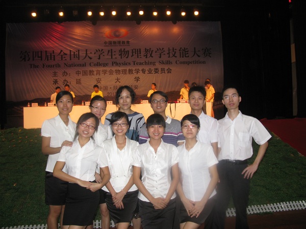 湛师新闻网8月29日讯 8月1至3日,由中国教育学会物理教学专业委员会主办的第四届“人教社杯”全国大学生物理教学技能大赛在延安大学举行,共有来自全国29个省市自治区的102所高校,共计700余名选手参赛。代表我校参赛的物理学院物理学专业09级8名同学取得了骄人的成绩,龙月通、袁蓝燕、张灿均、龙其忠、陈颖晶、吴敏仪、冯婷婷等7位同学荣获一等奖(最高奖),崔晓同学荣获二等奖,这是我校参加该赛事以来取得的最好成绩。刘晓莹、刘小平、黄桦、张道清、薛书文和刘贵昂等6位老师获优秀指导教师奖,同时我校荣获优秀团体奖。