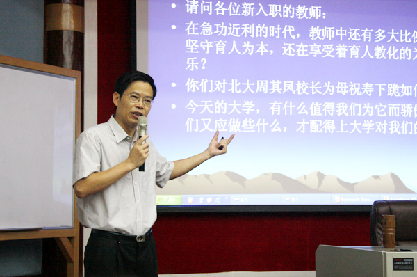 学校罗海鸥院长在培训班上亲自主讲《高等教育学》第一专题“大学精神与大学理念”。罗院长以“我们应该做什么才能配得上大学的期望”等问题导入,在场新教师积极思考,踊跃发言,课堂气氛十分活跃。罗院长以宽广的国际视野,丰厚的学术底蕴,高屋建瓴,引经据典,剖析了国内外著名大学的办学理念、大学精神以及如何培养杰出人才等问题,引发了学员们的深入思考,有助于学员们树立正确的职业理想和职业精神。罗院长指出,大学理念是大学安身立命之根本,而大学精神是立足大学本性的质的规定性。它们的核心就是追求真理、立己树人、建树新风。为人师者之要在于积极而深刻地影响学生。他希望并鼓励新教师努力做学生感念和骄傲的老师。