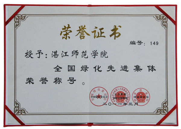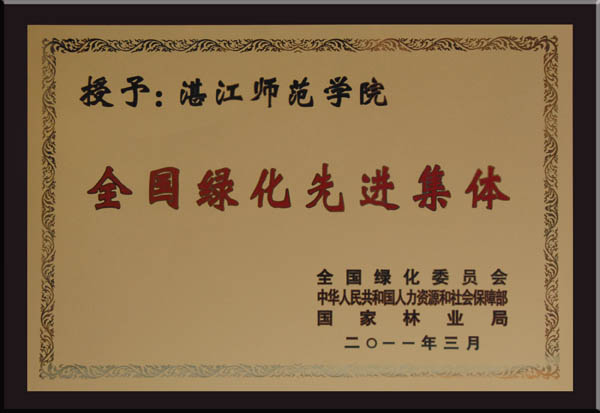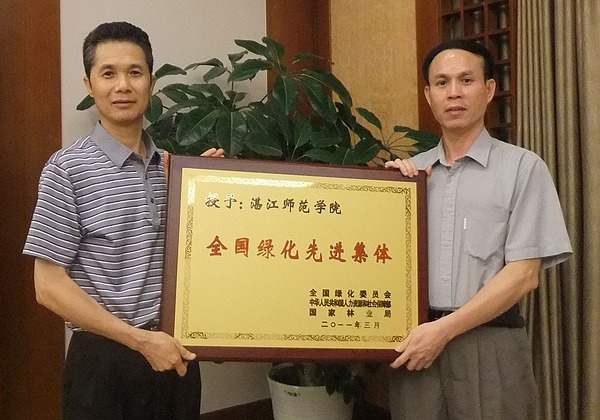 2009年10月以来,学校专门成立了“创建全国绿化模范单位领导小组”,统筹部署全校绿化美化工作,后勤干部职工一起精心尽责打造绿色校园。2010年省、市绿化委领导多次亲临我校指导工作,并参观了饱含人文底蕴的校园,感受古榕广场的源远流长,百年师范纪念塔的历史昭示,寸金广场的现代气息,感受湛师校园的绿色文化和积极向上的精神风貌。2011年3月,全国绿化委员会等三部委正式联合发文,我校获得全国绿化最高奖项——“全国绿化先进集体”的殊荣。