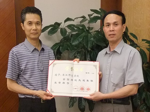 湛师新闻网7月4日讯 2012年6月26日,广东省林业厅陈俊勤巡视员专程来湛江给我校颁发了“全国绿化先进集体”的牌匾和荣誉证书。
