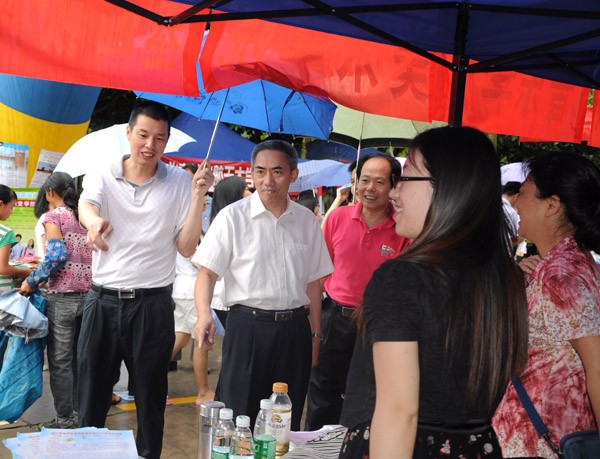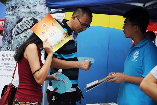 十二年的寒窗苦读,十二年的梦想追逐,一年一度的高考终究落下帷幕,但紧接而来的又是让考生与家长十分紧张的志愿填报工作。而今早的高校招生咨询会无疑给了考生与家长们一个很好的平台解决各种疑难。燕岭大道上摆满了各高校的“摊位”,大红色的横幅与宣传单张随处可见。虽然九点多的时候下起了雨,但阻挡不了考生与家长们的热情,他们穿梭每个帐篷,仔细咨询,一路走过去,手中都抱满了各所院校的招生简章等资料。其中,今年我校更是充分发挥“主场”的优势:每个二级学院均设立一个“摊位”,方便广大考生、家长在了解我校的整体情况同时更确切了解到各二级学院及其专业设置方面的信息。据记者观察,考生、家长的问题主要集中在我校往年录取分数线、哪个专业更热门、师资力量如何等。