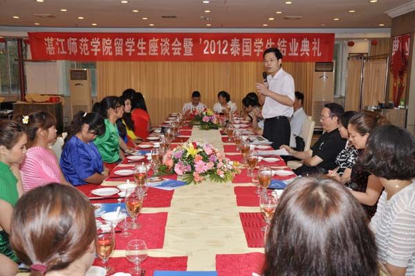 湛师新闻网6月5日讯 6月1日,我校在园府酒店举行留学生座谈会暨2012泰国学生结业典礼。我校罗海鸥院长、国际交流与合作处邓逢光处长、人文学院熊家良院长、美术学院巨云和副院长、泰国12名交流生,韩国、越南6名留学生等出席了结业典礼。典礼由邓逢光处长主持。