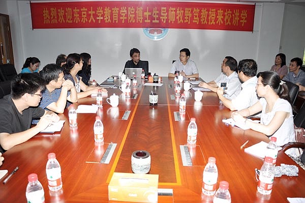 出席上午座谈会的有罗海鸥院长、邓逢光主任、教育学学科成员、教科院部分教师、卓越实验班的部分导师和学生。座谈会由教育研究院常务副院长李方教授主持。首先,会议举行了牧野笃教授受聘客座教授仪式,罗海鸥院长为牧野笃教授颁发了聘书。罗院长在致辞中对牧野笃教授来我校讲学表示热烈欢迎,接着罗院长简要概述了我校教育学近几年的发展状况,希望我校教育学科的教师们抓住机会多学习、多交流,使我校教育学科快速发展。紧接着,牧野笃教授以“学习:人和社会的生存方式——知识传播模式的转变和终身学习”为主题,分析了日本20世纪以来,知识传播模式的发展与转变、学习与生存之间的变化,介绍了日本推行终身教育与终身学习的措施。教育学科的骨干教师们听完牧野笃教授的介绍,纷纷提出所关心的问题,牧野笃教授逐一作耐心的解释和回答。