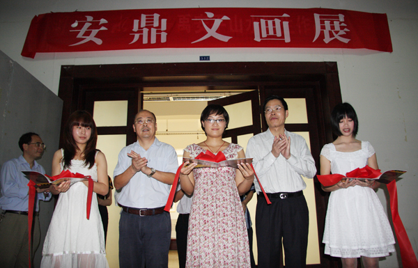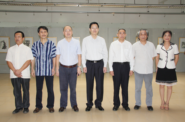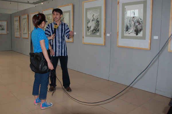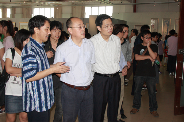 领导、嘉宾、老师和同学们纷纷入场参观。湛江电视台记者对安教授进行了采访,安教授阐述了创作的感受和体会。