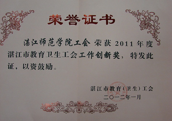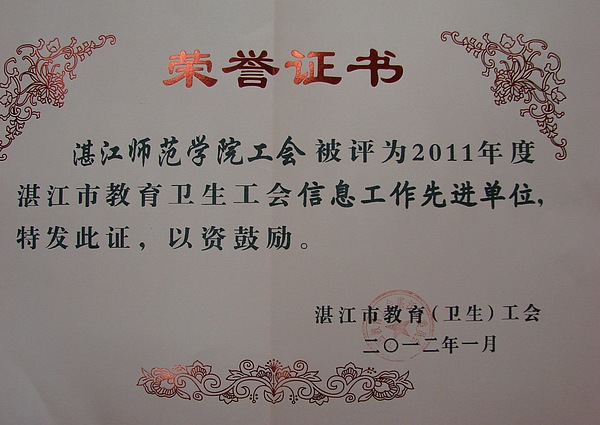 会议学习传达广东省教科文卫六届二次全委(扩大)会议精神;总结2011年市教育(卫生)工会工作,部署2012年工作任务;表彰2011年度湛江市教育(卫生)工会工作先进单位和个人。其中,我校教育工会荣获2011年度“湛江市教育(卫生)工会工作创新奖”和“湛江市教育(卫生)工会信息工作先进单位”两项殊荣,我校教育工会郑赞芳同志荣获“湛江市教育(卫生)工会优秀通讯员”荣誉称号。