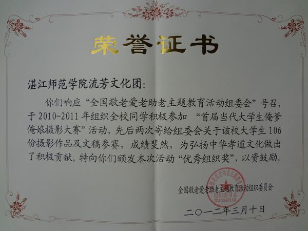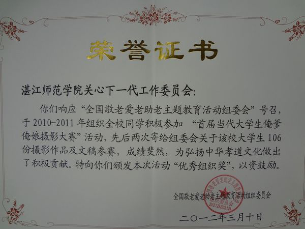 湛师新闻网4月1日讯 近日,由北京市全国老龄事业发展基金会寄来了“全国敬老爱老助老主题教育活动组委会”分别颁发给我校关心下一代委员会、流芳文化团这两个单位的荣誉证书。此证书表彰了我校两个单位在组织学生参加“首届当代大学俺爹俺娘摄影大赛”中作出的斐然成绩,特此颁发“优秀组织奖”。