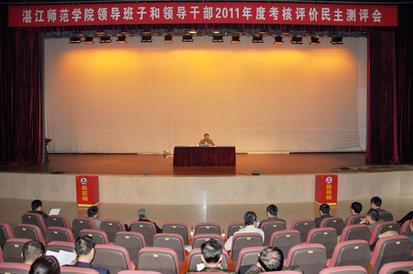 湛师新闻网3月3日讯 1日下午,我校在音乐厅召开领导班子和领导干部2011年度述职测评大会。校领导梁英、罗海鸥、刘海涛、黄钢、李永全、刘周堂、李江凌、邵乐喜,全校副处(含相当)以上干部、正高级专业技术职称人员和各类代表、各民主党派负责人、党代会代表、教代会代表、博士和中青年教工代表、离退休教工代表、民主评议干部工作委员会成员、各级人大代表和政协委员代表等270多人出席了会议。校党委梁英书记主持大会,并代表学校领导班子作了述职报告。与会人员在聆听了领导班子和领导干部的述职后,以无记名投票方式对他们进行了民主测评。