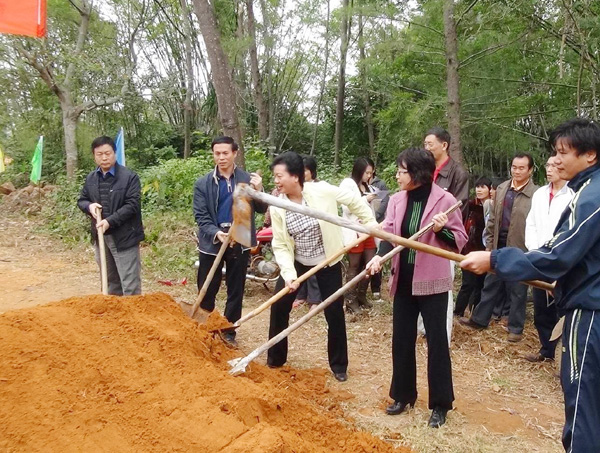 梁英书记、黄钢副书记、陈俊副县长、邓妍妍部长在开工仪式现场铲土奠基。
