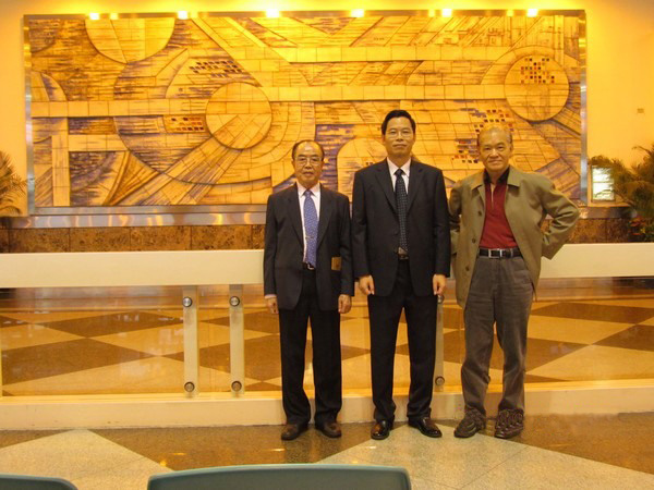 与冯观富先生、朱邦雄博士在高雄机场的朱邦雄陶壁艺术作品前留影