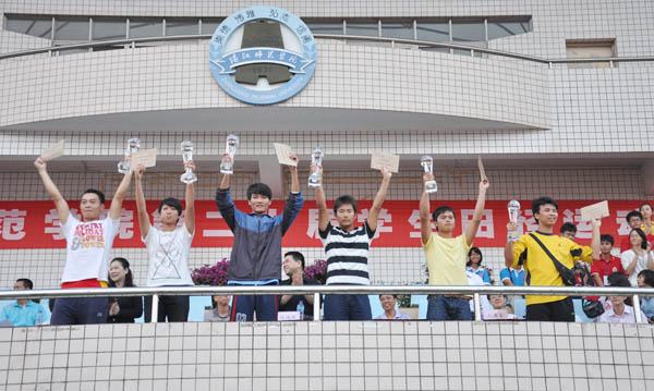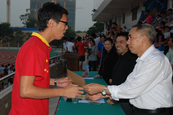 接着,组委会领导为获奖单位和个人颁奖,其中包括:普通组团体前六名代表队、专业组团体前六名代表队、“体育道德风尚奖”获奖单位、刷新运动会记录的运动员。