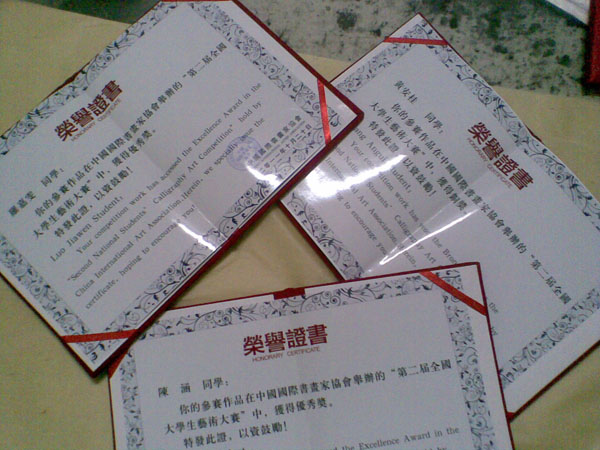 在个人成绩方面,更是异彩纷呈。在省第三届新人新作书法展中,邹景强、陈颖君、李林惠、唐杰作的作品获得优秀奖,并直接成为广东省书法家协会会员;邓志玲、李韵琪等4人被聘为王铎故里书画院名誉院长;在2009年“广东省首届书法和绘画大赛”中,24人参赛,23人获奖;在“岳阳楼杯”全国书法大赛中,我校书法协会参加比赛的13名同学全部获奖,其中五人夺金八人获银;就在今年举办的“南粤校园党旗红”广东省高校书画摄影大赛中,书协五位参赛者的书法作品再次获奖。