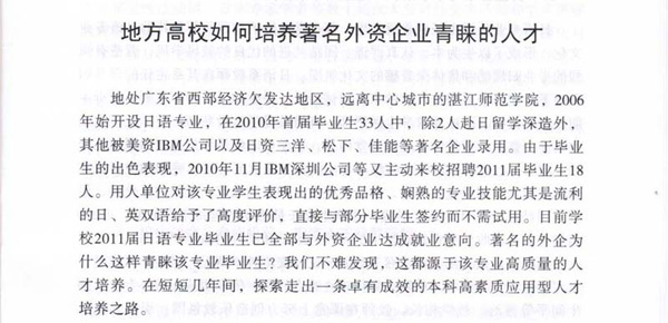 湛师新闻网10月17日讯 由教育部主管、国家教育行政学院主办的《高教领导参考》,在2011年第17期发表《地方高校如何培养著名外资企业青睐的人才》一文,介绍我校日语专业人才培养经验。