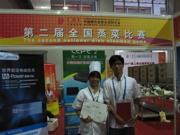 湛师新闻网10月16日讯 9月22日,2011年第二届全国蒸菜比赛在广州琶洲展馆A区2号馆顺利举行,来自全国大中餐饮企业的“名厨”、 全国高校的优秀教师和学生近80名选手参加角逐。我校派出生科院09烹饪班龚雪娟、陈国永两位同学参加比赛,荣获银奖1项、铜奖1项。