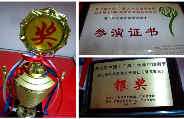 由广州市文广新局、广州市文联主办,广州话剧艺术中心、广州市剧协承办的第七届中国(广州)大学生戏剧节暨庆祝建党90周年校园戏剧系列活动,历时五个月,其高潮是9月21日至26日的决赛周的演出活动,最后于9月26日晩拉下帷幕,各个奖项也尘埃落定。我校雷雨话剧社的表演节目《雷氏絮雨》于9月24日晚成功上演,并获得银奖。自从2005年雷雨人首次携长剧《紧闭·戈多》参加大戏节获得“表演奖”后,这是雷雨话剧社第二次登上大戏节的舞台。六年来我校雷雨话剧社一直养精蓄锐,秣马厉兵,再一次凭借原创剧本向广东话剧界证明了自己的实力。