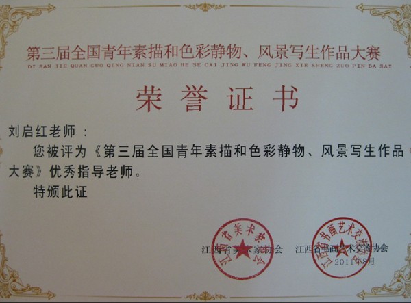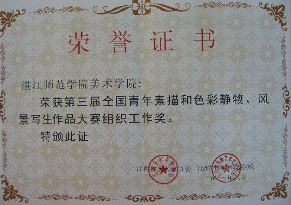 湛师新闻网9月27日讯 近日,第三届全国青年素描和色彩静物、风景写生作品大赛的组委会发来贺报,我校美术学院学生成绩斐然。有一名同学获得铜奖(奖金500元),7名同学获得优秀作品,25名同学获得入选奖。美术学院因为成绩显著被主办单位授予“优秀组织工作奖”,刘启红老师因指导多名学生入选和获奖,被主办单位授予“优秀指导老师”称号。