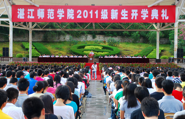 湛师新闻网9月14日讯 古榕飘香迎客来,百年学府喜迎新。昨日上午,我校在雷阳广场举行2011级新生开学典礼。校领导梁英、罗海鸥、刘海涛、李永全、刘周堂、李江凌、邵乐喜,相关部门、二级学院、基础教育学院负责人,教师代表、辅导员;2011级校本部普通本科生、专升本插班生、开放学院新生及基础教育学院南校区普通生;参加了典礼。开学典礼由李江凌副院长主持。