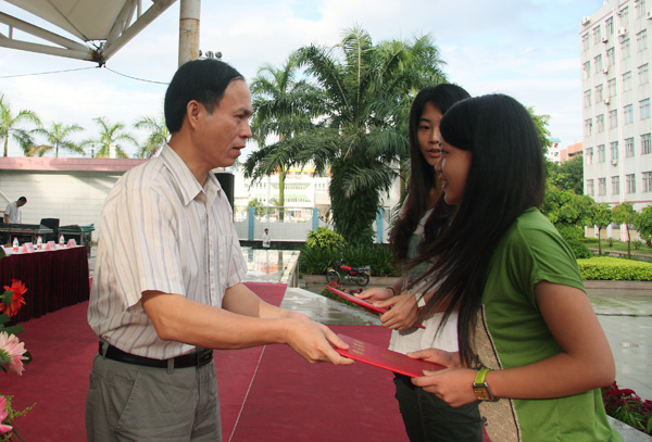 典礼上,刘周堂副院长宣读关于奖励我校2011级优秀新生的决定后,梁英书记为林淑雯、莫水清两名优秀新生代表颁发证书。随后,罗海鸥院长为典礼致辞。