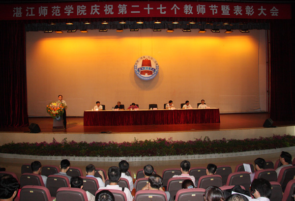 湛师新闻网9月10日讯 8日下午,我校在音乐厅隆重举行庆祝第27个教师节暨表彰大会。学校领导梁英、罗海鸥、刘海涛、李永全、刘周堂、李江凌、邵乐喜,各二级单位主要负责人、各二级学院分管教学负责人、受表彰的先进集体和个人以及部分教师代表出席了本次大会。会议由罗海鸥院长主持。