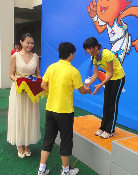 湛师新闻网9月4日广州讯 在昨天进行的比赛中,我校运动员努力拼搏,为我校代表团再添两银两铜。在乙组女子5000米决赛中,我校吴建梅再次获得银牌,成为双料亚军;朱婵如获得铜牌。在武术比赛中,我校乙组男子对练获得亚军,乙组女子对练获季军;武术比赛于昨天下午结束全部赛事,我校武术队还获团体总分第八和体育道德风尚奖。