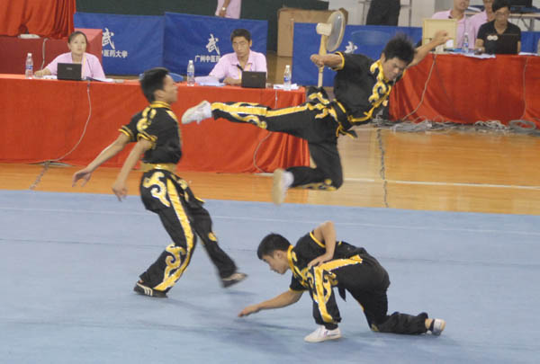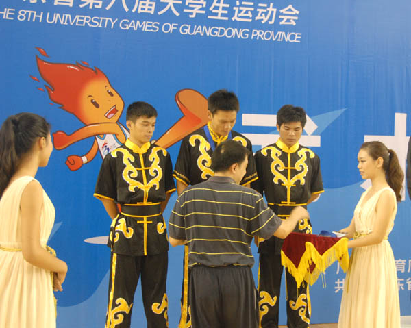 颁奖嘉宾为武术乙组男子对练银牌得主江秋旭、陈威、林昌启颁奖。