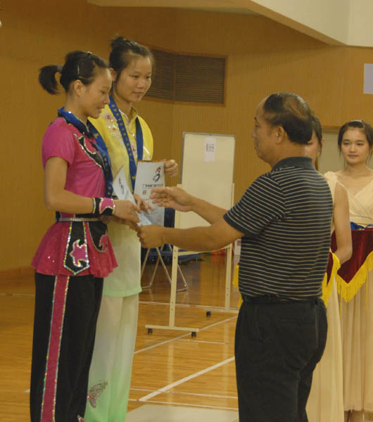 颁奖嘉宾为武术乙组女子对练铜牌得主陈超、陈小娴颁奖。