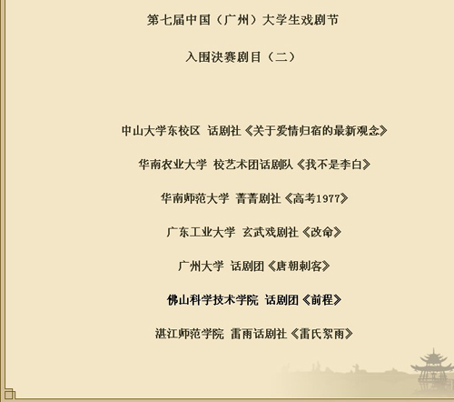 湛师新闻网9月2日讯 经第七届中国(广州)大学生戏剧节的评委会小组评审,我校雷雨话剧社第十二部长剧《雷氏絮雨》以其新颖的取材及独具特色的表演方式在众多话剧作品中脱颖而出,进军大戏节决赛。届时,雷雨话剧社将与中山大学、华南师范大学、华南农业大学、广东外语外贸大学、广州大学等十余所省内知名院校的话剧社团同台竞技。在决赛名单中,雷雨话剧社是唯一一个非广佛地区的高校社团。