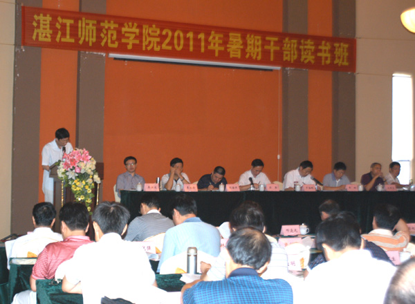 湛师新闻网8月27日讯 8月25-26日,我校2011暑期干部读书班在御水古温泉度假村举行。本次读书班主要任务是进一步总结我校2010年教育思想大讨论活动的阶段性成果,围绕学校20年来举办本科教育的发展历程,全面总结学校本科教育和培养高素质应用型人才的办学经验,结合学校当前的实际工作开展学习、探讨,深入推进学校人才培养模式的改革创新,加快建设特色鲜明的高水平师范院校。校领导梁英、罗海鸥、刘海涛、黄钢、李永全、刘周堂、李江凌、胡克伟,学校副处级以上干部和基础教育学院、附中的党政领导参加了读书班的学习。