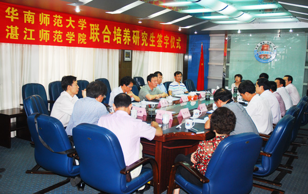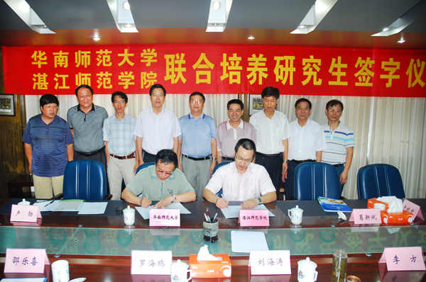 湛师新闻网7月25日讯 7月21日上午,华南师范大学与我校联合培养研究生的签字仪式在一号会议室举行。出席签字仪式有华南师大研究生处处长肖鹏教授、教育科学学院院长卢晓中教授、华南师大研究生处副处长卢勃研究员、华南师范大学教育科学学院院长助理葛新斌教授。我校领导罗海鸥、刘海涛、邵乐喜,科技处主要负责人及部分教育学学科骨干成员参加了签字仪式。会议由邵乐喜副院长主持。