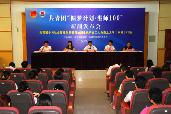 湛师新闻网7月24日讯 22日上午,我校和团湛江市委共同推进的“圆梦计划•湛师100” 签约仪式暨新闻发布会在我校图书馆学术报告厅举行,同时接受了新生代产业工人(主要在湛务工农村青年)现场报名。这标志着“圆梦计划•湛师100”项目正式实施。我校成为广东省首个承担共青团“圆梦计划•”的高校。