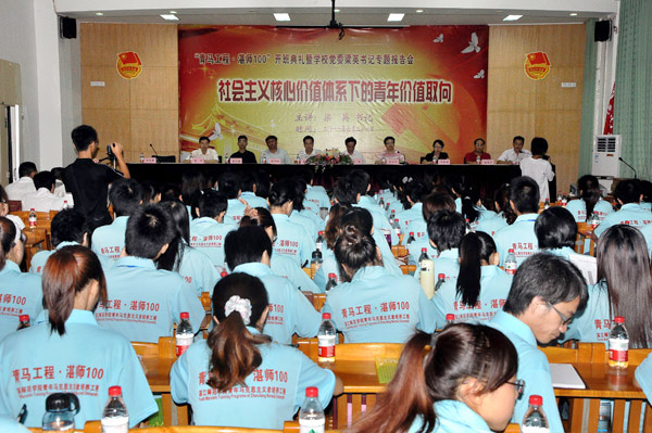 湛师新闻网6月27日讯 昨天上午,我校筹备已久的“青马工程•湛师100”开班典礼暨学校党委梁英书记专题报告会在鸿园四楼学术报告厅隆重举行。出席开班仪式的领导有:“青马工程”组长、学校党委梁英书记,副组长、校李江凌副院长,组员:校党委办公室彭权群主任、校党委组织部邓妍妍部长、校党委宣传部陈恕平部长、教务处程可拉处长、学生工作处黄达海处长、思政部袁铎副主任、校团委李粤书记、李发武副书记。另外,各二级学院党委副书记、团委负责人和全体学员也出席了大会现场。