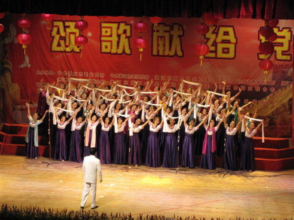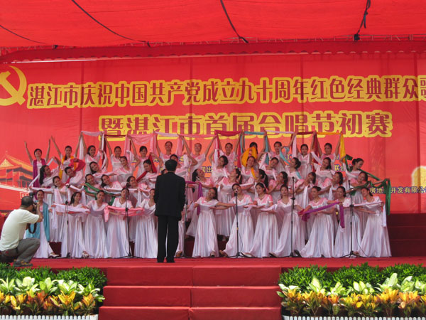 湛师新闻网6月24日讯 湛江市庆祝中国共产党建党90周年红色经典群众歌咏大赛暨首届合唱节由市委宣传部、市委组织部、市直属机关工委、市文广新局、市文联合、市教育局、市总工会、团市委、市妇联等举办,湛江日报社、市广播电视台、市建设发展集团有限公司协办。以庆祝中国共产党成立90周年,歌颂祖国,歌颂共产党,歌颂幸福美好湛江为主题,是湛江庆祝中国共产党成立90周年暨开展“四德、五心、六歌”活动一周年的大型文艺晚会。音乐学院女子合唱团代表湛江市霞山区参加了此次大赛。