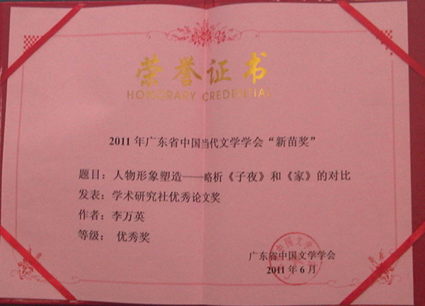 2、广东省中国当代文学学会学术“新苗奖”是广东省中国当代文学学会专门举行的两年一次的文学评论奖励,它以广东省高校在校学生为受奖主体,以学生对广东省当代作家的研究成果为对象,由广东省当代文学学会组织进行。2009年年会已经举行了首次评奖,2011年年会是第二届评奖,以近三年研究成果为受奖对象,由当代文学学会组织相关专家进行评奖。