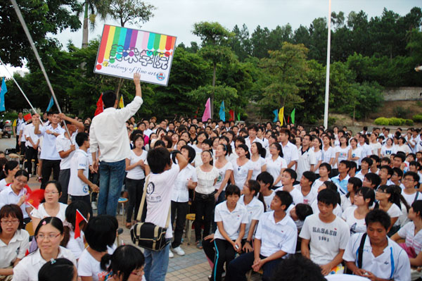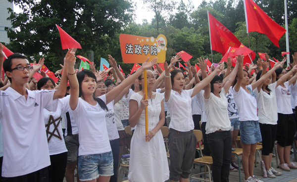 最后,为表达对党的无限热爱,全场人员在雨中合唱《没有共产党就没有新中国》,活动在雄壮嘹亮的歌声中圆满结束。有同学表示,大雨让这场活动变得更有意义,看到这么多人在大风大雨中依然坚持到最后,甚为感动,正如宣传横幅所说:“饮水思源科学发展永远跟党走,同心协力继往开来湛师与日新”。