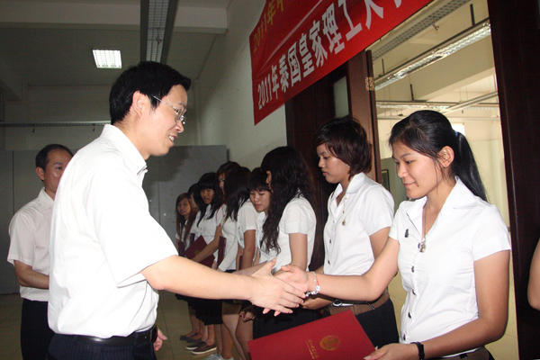 湛师新闻网6月1日讯 5月30日下午,校领导罗海鸥院长在国际交流与合作处邓逢光处长、人文学院熊家良院长、美术学院王黎明院长、李爱群书记、巨云和副院长以及国际交流与合作处郑志军副处长等的陪同下,出席了在咏雷教学楼五楼美术展览厅举行的2011年泰国皇家理工大学留学生结业典礼。活动由邓逢光处长主持。