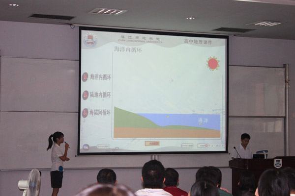比赛当天,广东省内7所设立地理师范类专业的本科院校的选手同台竞技,各展风采,为观众奉上一台精彩纷呈的师范生教学技能盛宴。我校08科教地理梁玉媚,08机电黎鉴晓,08物本1陈超荣参加了课件制作大赛环节,他们合作制作的Flash课件“自然界的水循环”,清晰明了地展示了课件中教学目的,教学过程和教学拓展等内容,加上当场精彩的讲解,勇夺了这次比赛中“课件制作”二等奖。另外,我校08科教地理学生伍方华参加了模拟课堂教学大赛环节,她从“贴近教材、贴近学生,贴近生活”出发,选取人教版高中地理天气系统中的“气旋”作为讲解内容,教学过程中教态亲和自然,教学逻辑清晰,精彩演绎了我校学生过人的教学魅力,获得了“模拟教学”三等奖。我校参赛学生赛场出色的表现赢得了在场评委们的一致认同与好评。同时,广东省教育厅周顺彬等评委老师也提出了非常有针对性的意见和建议,比如对新课标中的“学习终身有用的地理”剖析不够透切;课堂教学方法高校味较浓,不够贴近中学生学习特点;教学过程中,学生参与活动太少等。