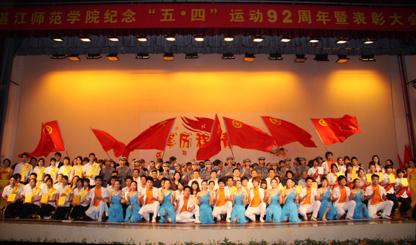 湛师新闻网5月8日讯 五四精神存千古,湛江师院表先进。6日晚,由校团委主办的“光辉历程·青春足迹”,纪念“五•四”运动92周年暨表彰大会在音乐厅隆重举行。团市委雷电副书记、校党委黄钢副书记、李江凌副院长、学生工作指导委员会全体成员、全体辅导员、受表彰人员和学生代表一同出席大会。会议由校团委李发武副书记主持。