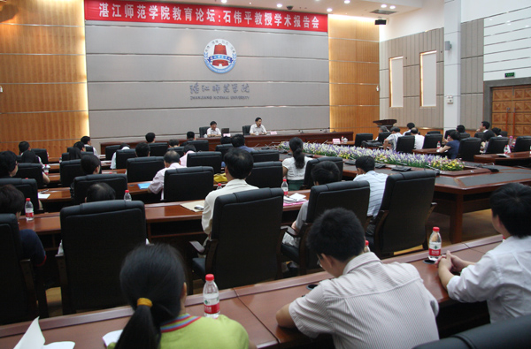 湛师新闻网5月5日讯 3日上午,全国职业技术教育学会副会长兼学术委员会主任委员、华东师范大学职业教育与成人教育研究所所长石伟平教授,来我校作题为“全球视野下中外职业教育比较”的学术报告会。校领导罗海鸥、刘海涛、刘周堂、李江凌、邵乐喜,部分二级学院院长及分管教学副院长、教育学科成员、教科院教师,以及教育研究院副院长、湛江市教育局李尚武副局长,湛江市部分中职学校的校长等出席了报告会。会议由罗海鸥院长主持。