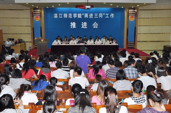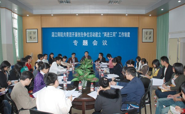据悉,2010年末,在学校党委与团省委指导下,我校在全省高校率先开展“两进三同”活动。校团委书记、副书记以及4名基层团委书记作为第一批团干部深入学生当中,开展为期一周的“两进三同”活动,受到了团省委的高度肯定和中国青年报的报道;在4月上旬,我校继续探索“两进三同”团建新模式,团委李粤书记带领全体基层团委负责人,深入湛江的一些知名企业,在企业中开展“两进三同”工作,开创了高校“两进三同”的新模式,打造了校企合作新平台;4月中旬,我校制定了“两进三同”工作制度和设计了“两进三同”记事本,成立以学校领导李江凌副院长为组长的“两进三同”工作领导小组,隆重召开了“两进三同”工作推进大会,由学校领导统一布署,在二级学院党委副书记,全体辅导员中深入开展“两进三同”工作,此外,校团委还在其网站开辟“两进三同”专栏,并建立我校“两进三同”的短信互动端口平台和139说客,进一步推动基层“两进三同”工作的全面活跃,促使我校“两进三同”工作向纵深方向发展。
