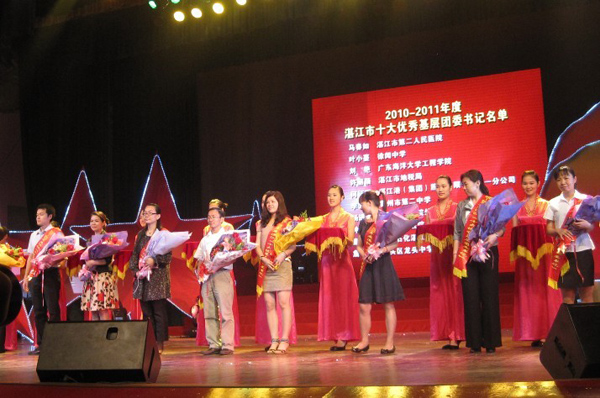 湛师新闻网4月29日讯 昨晚,在湛江市海港影剧院隆重举行的“湛江市纪念五四运动92周年暨“十杰百优”颁奖大会上,外国语学院杨进军老师被授予“湛江市十大优秀基层团委书记”荣誉称号。在此次大会上,外国语学院2009级涉外翻译团支部获“湛江市五四红旗团支部”、2009英语教育(3)团支部李舒婷同学获“湛江市优秀共青团员”等荣誉称号。