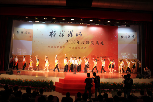 颁奖典礼首先表彰了2010年学生工作先进集体和个人,学校领导刘周堂、李江凌、邵乐喜副院长,学校党委办公室彭权群主任分别颁发了湛江师范学院2010年度“新生教育先进学院奖”、“学生工作特色项目奖”、“优秀辅导员奖”和广东省2010年度学生工作先进个人奖。随着音乐学院张霞同学深情动人的《长大后我就成了你》歌声,背景大屏幕播放了我校优秀辅导员的事迹短片,引发了学生的热烈掌声,将典礼推向第一个高潮。
