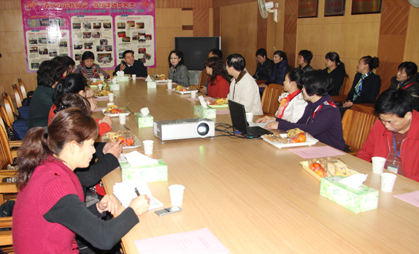 校女工委主任邵小荃向市妇联领导们汇报了学校女工委的工作。主要包括四个方面的内容。一,建设一支年轻有活力水平能力高的女工干部队伍;二,以“巾帼文明岗”的建设为典范,鼓励我校女教职工建功立业,岗位成才;三,建立互助互爱的平台,主动承担社会服务的责任;四,维护广大妇女儿童的合法权益,共同构建和谐家庭、和谐湛师。