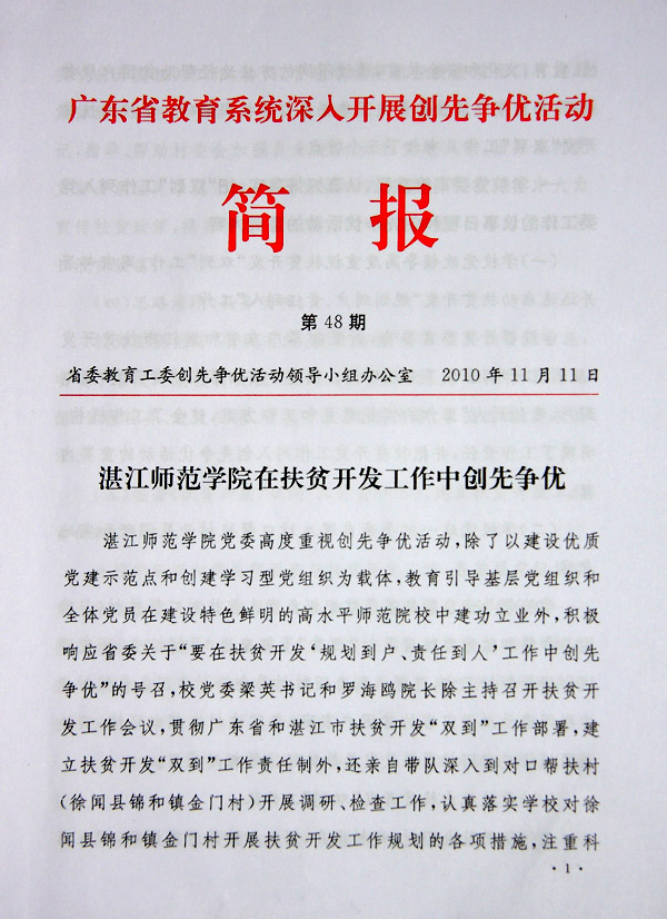 湛师新闻网3月6日讯 近日,广东省委教育工委创先争优活动领导小组办公室主办的《广东省教育系统深入开展创先争优活动简报》第48期,推介我校扶贫工作的经验:《湛江师范学院在扶贫工作中创先争优》;该期《简报》仅刊发了我校的此篇文章。这是上级对我校扶贫工作的充分肯定。