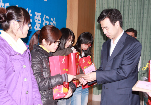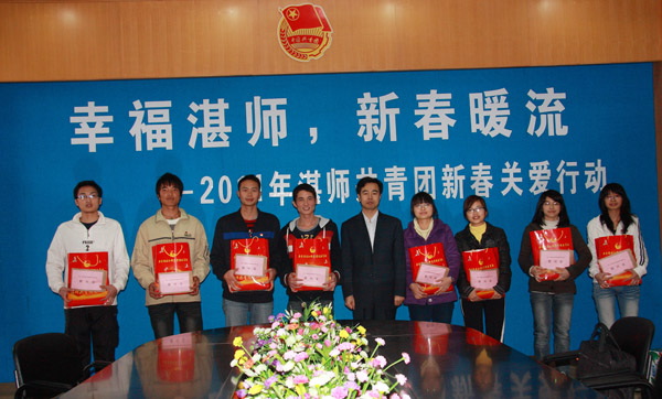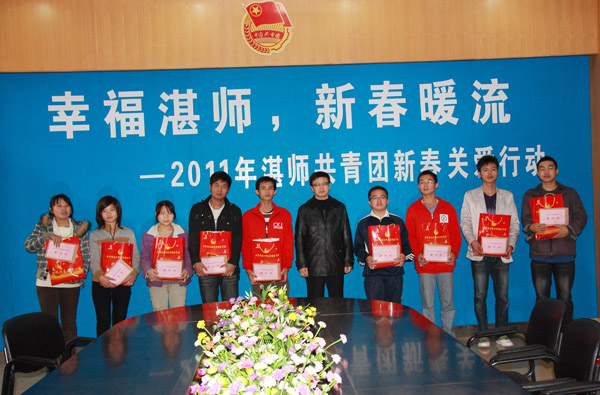 最后,杨松副部长一行在李江凌副院长的陪同下,在综合会议室参加了正在举行的《幸福湛师 新春暖流——2011年湛师共青团新春关爱活动》,杨松副部长、李江凌副院长、雷电副书记分别为我校的留校贫困生送上新春关爱大礼包,领导的温暖和关怀深深打动了在场青年学子的心。