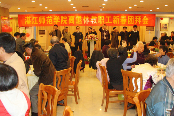 湛师新闻网1月22日讯 今天下午,我校在学术交流中心二楼举行2011年离休教职工新春团拜会。学校领导梁英、罗海鸥、刘海涛、黄钢、李永全、刘周堂、李江凌、邵乐喜、胡克伟,以及党办、院办、组织部、宣传部、人事处、财务处、审计处、工会、门诊部和离退办等单位负责人、全体离退休教职工参了加团拜会。团拜会由学校党委刘海涛副书记主持。