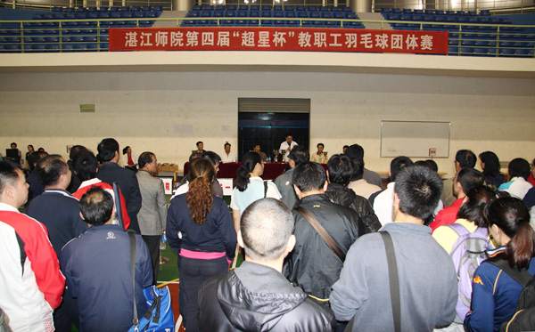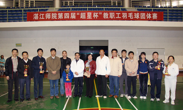 湛师新闻网12月30日讯 昨晚,我校历时五天的第四届“超星杯”教职工羽毛球团体赛,经过激烈的角逐,终于画上了圆满的句号,并于雷阳区体育馆举行了闭幕颁奖仪式。学院党委副书记刘海涛、副院长邵乐喜、校工会领导、运动员和裁判工作人员出席了此次比赛的闭幕式。闭幕式由校工会常务副主席何征强主持。