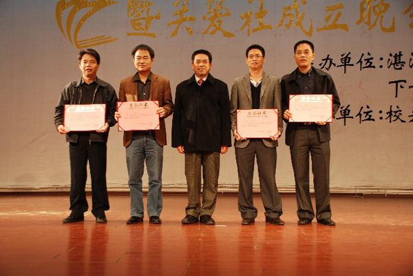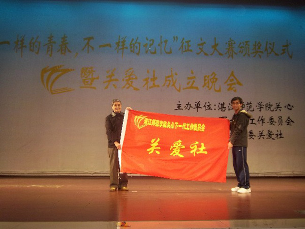 湛师新闻网12月27日讯 25日晚上,我校关工委在音乐厅举办了“一样的青春,不一样的记忆”新生征文大赛颁奖晚会暨关爱社成立文艺晚会。晚会为征文比赛获奖的同学进行颁奖表彰,并对在关工委举行的“知心友·谈心亭” 系列活动中取得优异成绩的先进单位和个人给予表彰。其次授旗给关工委新成立的关爱社。校党委刘海涛副书记、党委宣传部陈恕平部长、关工委李德主任、学生处黄达海处长等领导,校关工委三十多名委员、关爱社全体社员以及参加征文比赛的同学出席了当晚晚会。