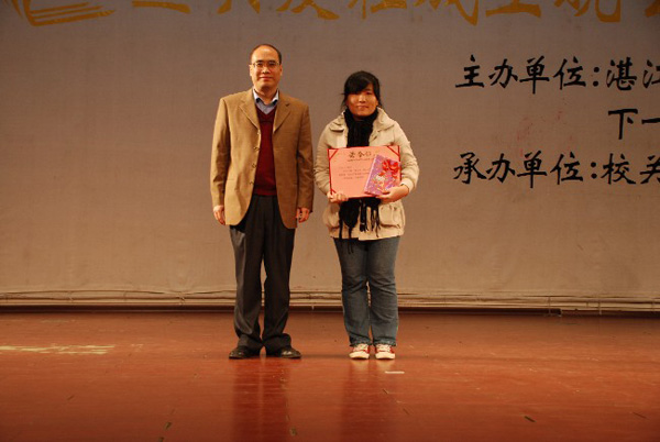 接着,校关工委为在征文比赛中获奖的学生颁奖。其中教育科学学院、人文学院、数学与计算科学学院、物理科学与技术学院获得了优秀组织奖。人文学院的王柳茵、商学院的徐小兰获得了一等奖;数学与计算科学学院的卢静仪、外国语学院的钟春媚、教育科学学院的郭淑婷和化学学院的陈雅婷获得了二等奖,数学与计算科学学院的杨美琴、法政学院的陈秋彤、教育科学学院的陈嘉凤、人文学院的陈蔼君、物理学院的林贤玲和车思敏获得了三等奖。还有李诗等30名同学获得了这次征文的优秀奖。此外,法政学院何翠娴同学参加了由校关工委谈心亭组织的全国第三届“助学政策,助我成才”征文活动中获得优秀奖。